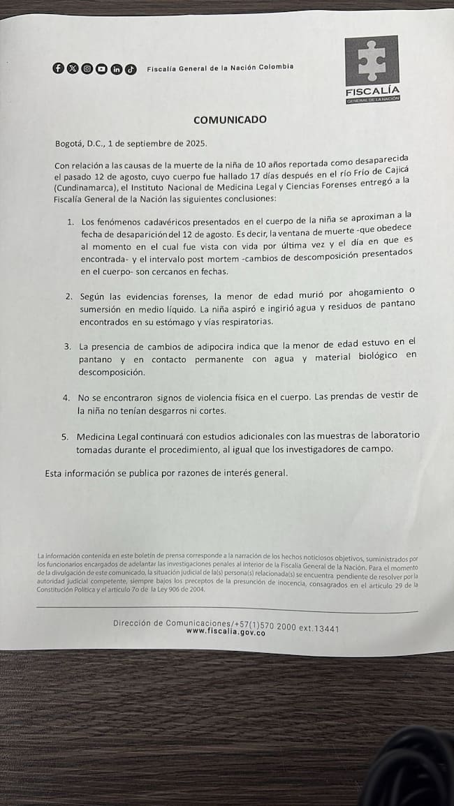 Además, el comunicado asegura que “los fenómenos cadavéricos presentados en el cuerpo se aproximan a la fecha de desaparición del 12 de agosto”, lo cual querría decir que la muerte de la menor ocurrió en una fecha cercana a su desaparición.