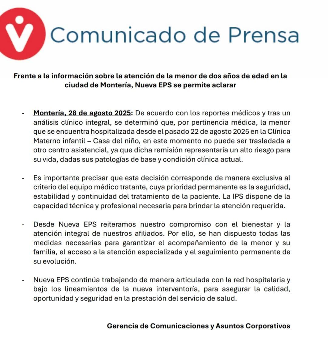 Frente al lamentable caso, desde la cuestionada Nueva EPS, se insistió en un comunicado emitido el 28 de agosto del año 2025, en el que se referían a la condición de la pequeña:
