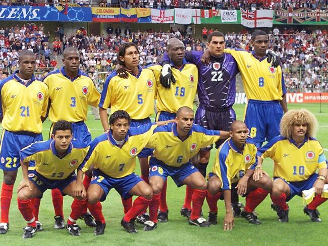 Selección Colombia de 1998: Leider Preciado, Everth Palacios, Jorge Bermudez, Freddy Rincon, Farid Mondragon, Harold Lozano; bottom left, Wilmer Cabrera, Anthony De Avila, Mauricio Serna, Antonio Moreno, Carlos Valderrama) (ELECTRONIC IMAGE) AFP PHOTO (Photo credit should read GERRY PENNY/AFP via Getty Images) / GERRY PENNY