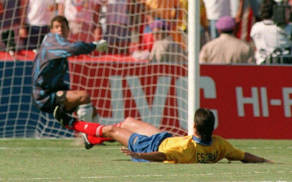 Momento en el que Andrés Escobar marca el autogol en el Mundial de Estados Unidos 1994 ante los anfitriones. (Photo credit should read ROMEO GACAD/AFP via Getty Images) / ROMEO GACAD