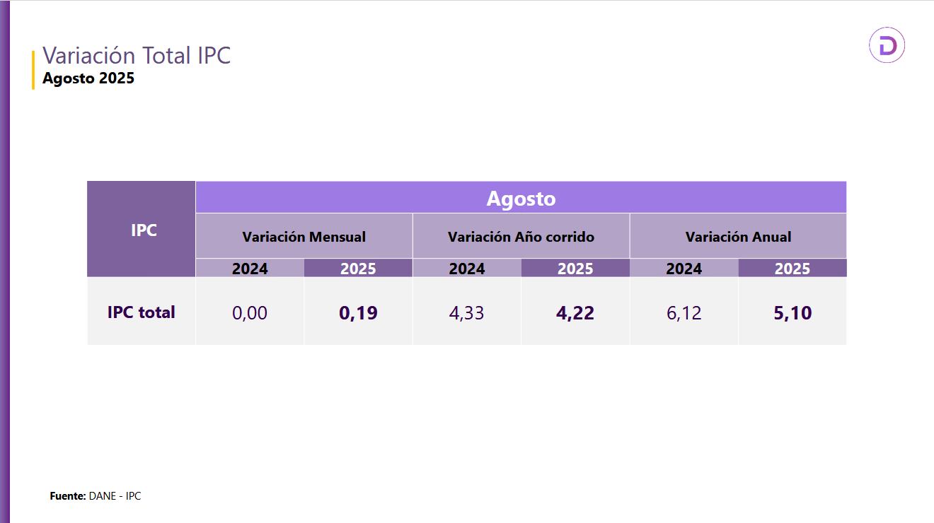 El DANE señaló: “En agosto de 2025 la variación anual del IPC fue 5,10%. El comportamiento anual del IPC total en agosto de 2025 (5,10%) se explicó principalmente por la variación anual de las divisiones Alojamiento, agua, electricidad, gas y otros combustibles y Alimentos y bebidas no alcohólicas”.