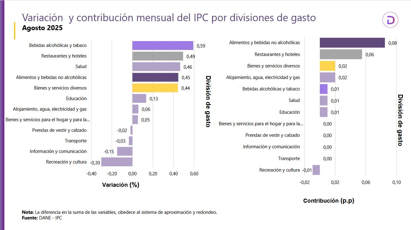 Según la entidad estadística, las divisiones de gasto que más jalonaron la inflación en su medición mensual para el octavo mes del año fueron: bebidas alcohólicas y tabaco; restaurantes y hoteles; salud; alimentos y bebidas alcohólicas.