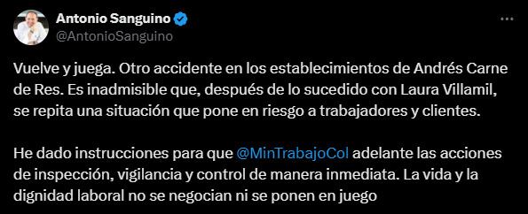 A través de su cuenta de X, el ministro Sanguino, dijo: “Vuelve y juega. Otro accidente en los establecimientos de Andrés Carne de Res. Es inadmisible que, después de lo sucedido con Laura Villamil, se repita una situación que pone en riesgo a trabajadores y clientes. He dado instrucciones para que MinTrabajo adelante las acciones de inspección, vigilancia y control de manera inmediata. La vida y la dignidad laboral no se negocian ni se ponen en juego”.
