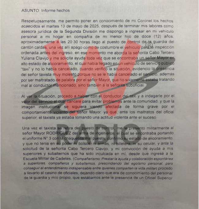 En el escrito, la oficial relató que, al llegar al puesto de control, se encontró con Rodríguez “en alto estado de alicoramiento”. Además, relató que este “no había cancelado el servicio” de un taxi” y que “no solamente estaba tratando mal al conductor mencionado, sino también a la suboficial” que estaba de guardia.