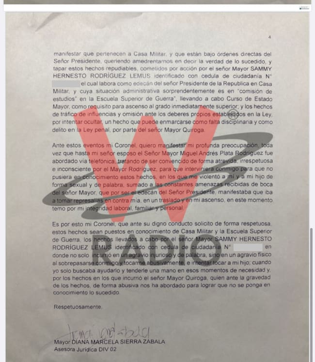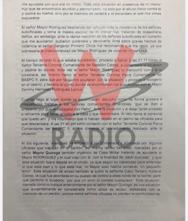 La mujer denunció ante sus superiores que, en hechos ocurridos el 13 de mayo de 2025 en el cantón Palonegro del Batallón Caldas en Bucaramanga, fue víctima de agresiones verbales y físicas por parte del mayor Sammy Hernesto Rodríguez Lemus, quien es edecán de la Presidencia de la República.
