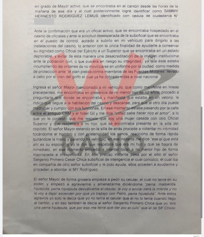 Más adelante, la oficial relató que el mayor Rodríguez la abordó en su carro y le preguntó: “¿Usted sabe hacer rico el amor?”. Según su versión, ella le respondió: “Respete, soy una mujer casada con otro oficial superior; respete a mi hijo”.