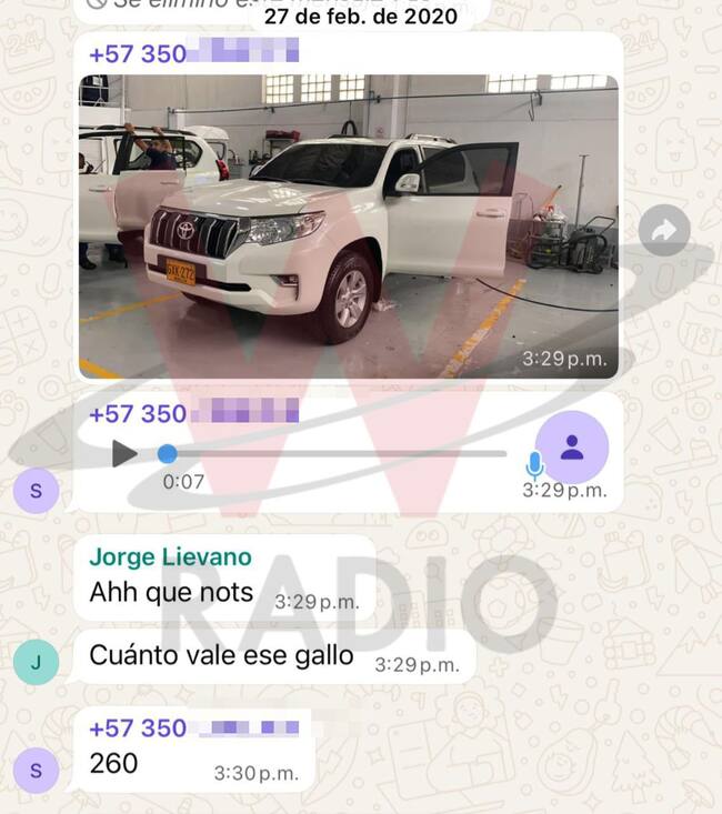 El tercer chat que W Radio tiene en su poder es del 27 de febrero de 2020. En este se observa que Miguel Quintero envía una fotografía de una camioneta Toyota Prada color Blanco perlado. Seguido a eso, manda un audio explicando que la está mandando a blindar y que, aunque la camioneta le costó 250 millones de pesos, el blindaje le costó 80 millones de pesos.