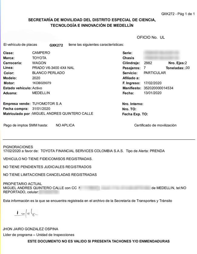- Una camioneta Toyota Prado blanca, por la que pagó 250 millones de pesos, y a la que luego le hizo un blindaje de 80 millones de pesos más.