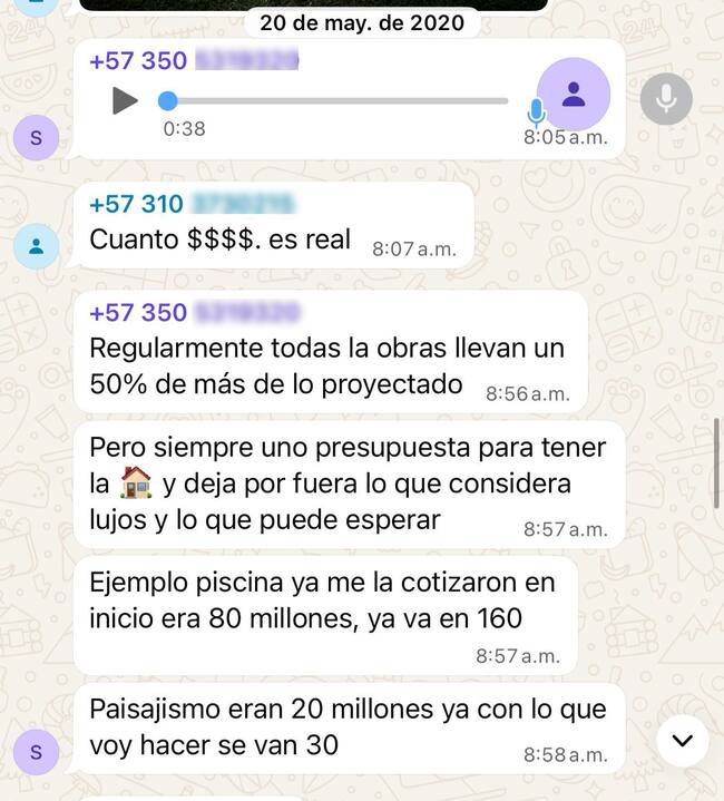 El primer Chat que obtuvo la W Radio tiene fecha del 23 de noviembre de 2020 y allí Miguel Quintero detalla la construcción de una mega casa de dos pisos de 2.500 metros cuadrados con piscina, zonas verdes y parqueaderos. Asegura que la piscina tuvo un costo de 160 millones de pesos y el proyecto de paisajismo 30 millones de pesos. Es importante decir que ese lote fue comprado por miguel en el año 2018 por 100 millones de pesos.
