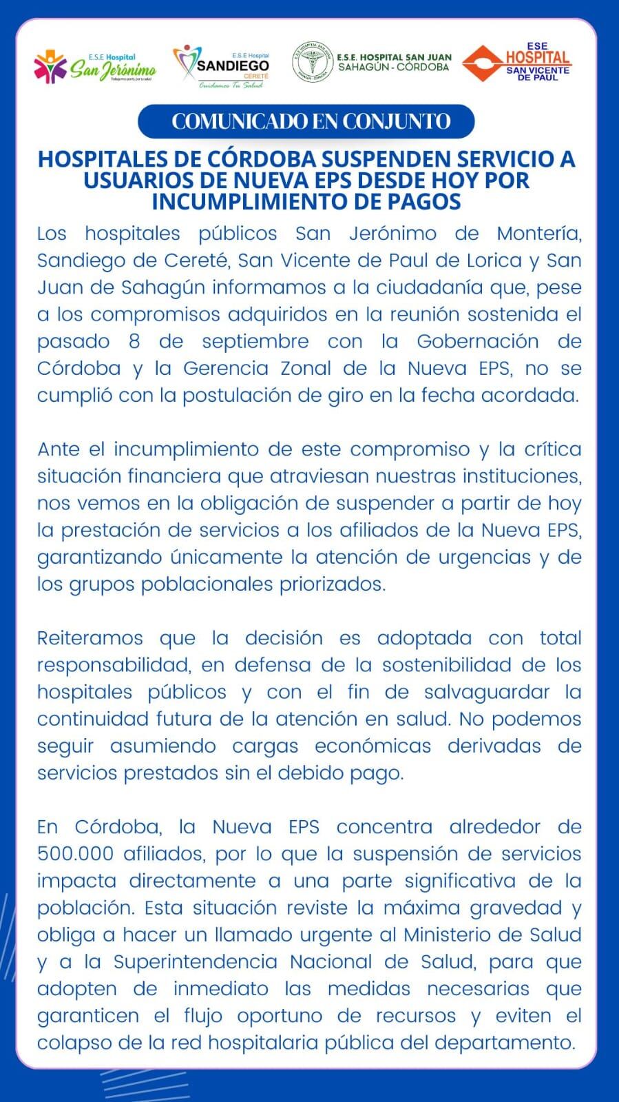 A través de un comunicado conjunto, los hospitales públicos San Jerónimo de Montería, Sandiego de Cereté, San Vicente de Paul de Lorica y San Juan de Sahagún informaron que, “pese a los compromisos adquiridos en la reunión sostenida el pasado 8 de septiembre con la Gobernación de Córdoba y la Gerencia Zonal de la Nueva EPS, no se cumplió con la postulación de giro en la fecha acordada”. El plazo vencía este viernes, 12 de septiembre.