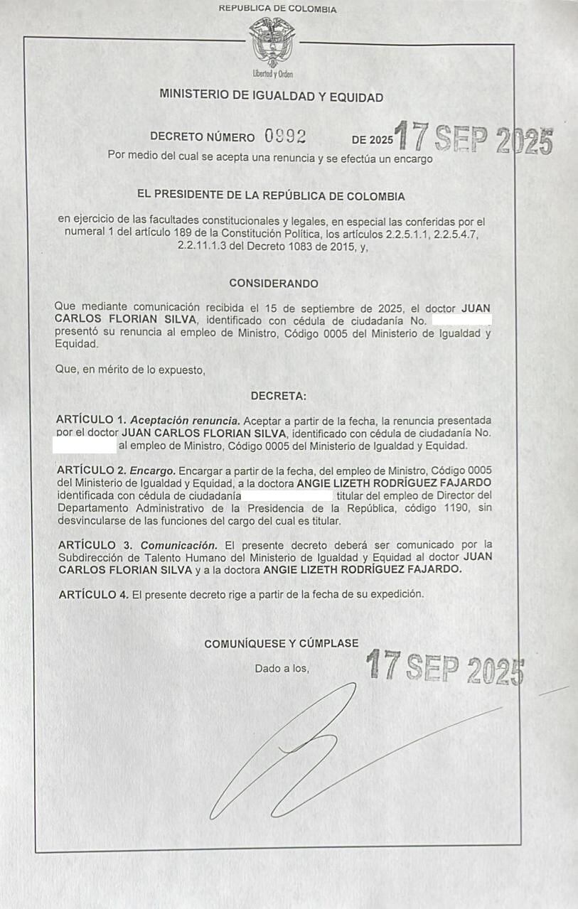 En la tarde de este miércoles, 17 de septiembre, a través del decreto 0992, el Gobierno Nacional aceptó la renuncia del ministro de Igualdad, Juan Carlos Florián, a quien el Tribunal de Cundinamarca había suspendido por presunto incumplimiento de la cuota de género en el gabinete.