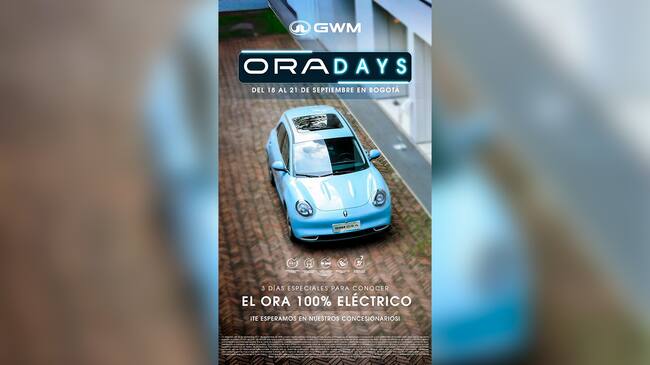 Del 18 al 21 de septiembre llega una nueva experiencia a Bogotá, pues se vivirán los ‘ORA Days’, en donde los asistentes van a poder descubrir el ORA 03 de GWM, que es 100% eléctrico, y que combina tecnología, diseño y sostenibilidad.