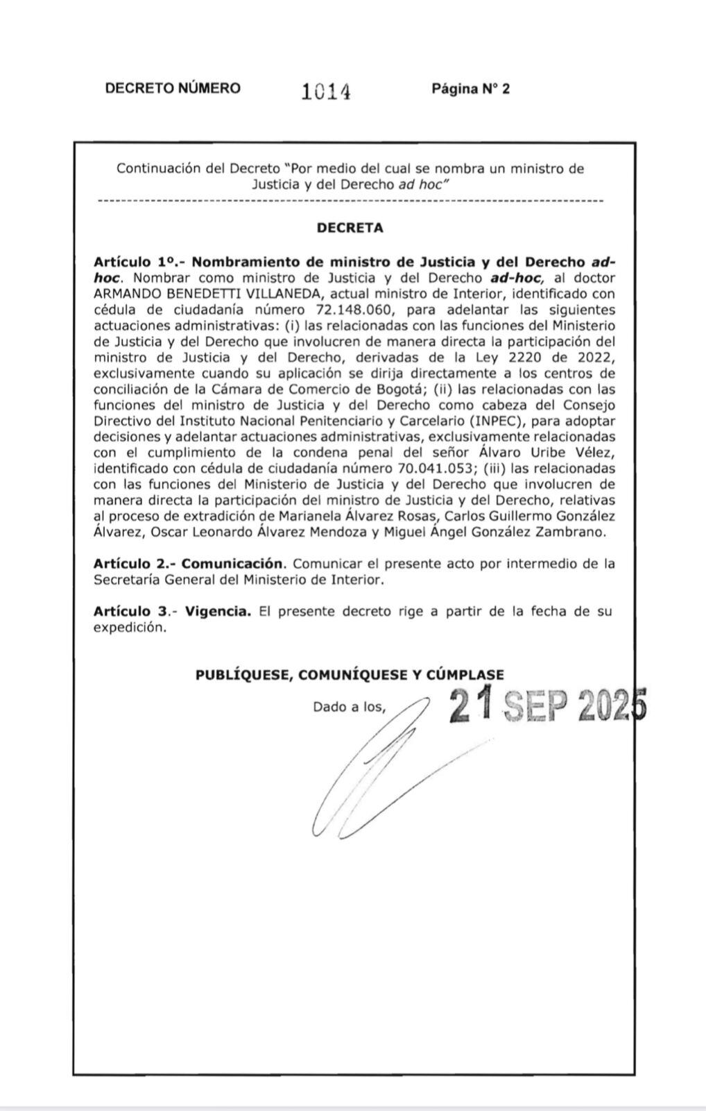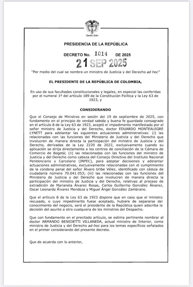 La Presidencia de la República, a través del decreto 1014 de 2025, designó a Armando Benedetti como ministro de Justicia ad hoc “para adoptar decisiones y adelantar actuaciones administrativas relacionadas con el cumplimiento de la condena penal contra el expresidente Álvaro Uribe Vélez”, por presunta manipulación de testigos.
