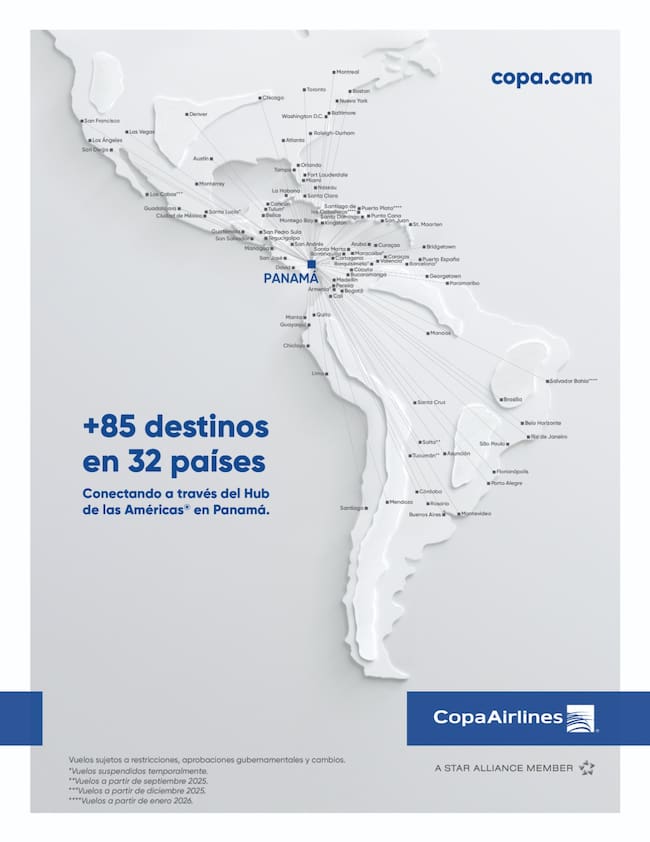 Puedes viajar desde los 10 destinos Copa en Colombia (Bogotá, Cali, Medellín, Pereira, Cúcuta, Bucaramanga, Cartagena, Barranquilla, Santa Marta y San Andrés) a Norte, Centro, Suramérica y el Caribe.