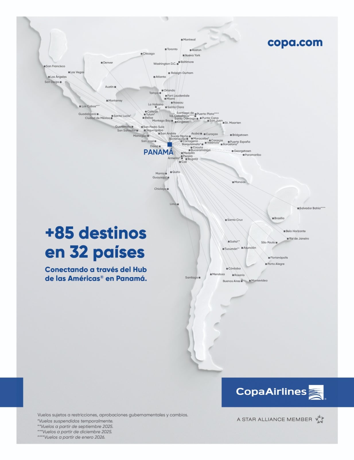 - El boleto no puede ser utilizado durante temporada alta que contempla las siguientes fechas: del 12 de diciembre de 2025 al 11 de enero de 2026, del 12 de junio de 2026 al 16 de agosto de 2026, del 11 de diciembre de 2026 al 17 de enero de 2027, Fiestas Patrias en Panamá, Carnavales en Panamá, Semana Santa, Acción de Gracias en Estados Unidos, Navidad y Año Nuevo. Copa Airlines se reserva el derecho de aplicar otras fechas con restricción de uso, sin que esto implique compensación al pasajero. Sujeto a disponibilidad de cupos en clase.