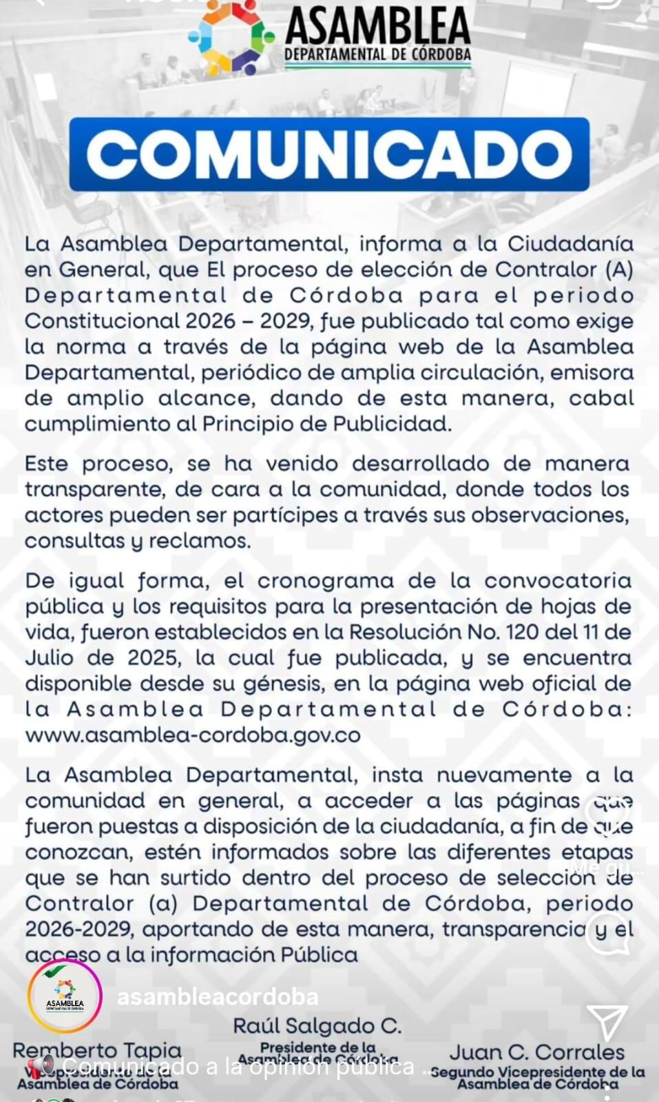 A través de un comunicado publicado en redes sociales, las directivas de la Asamblea de Córdoba manifestaron que “este proceso se ha venido desarrollando de manera transparente, de cara a la comunidad, donde todos los actores pueden ser partícipes a través de sus observaciones, consultas y reclamos”.