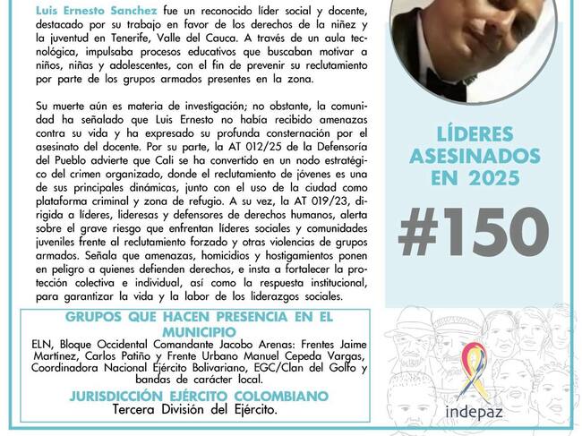 La más reciente víctima fue Luis Ernesto Sánchez, reconocido líder social y docente, destacado por su trabajo en defensa de los derechos de la niñez y la juventud en Tenerife, Valle del Cauca. A través de un aula tecnológica, impulsaba procesos educativos para motivar a niños, niñas y adolescentes, con el fin de prevenir su reclutamiento por parte de grupos armados presentes en la zona.
