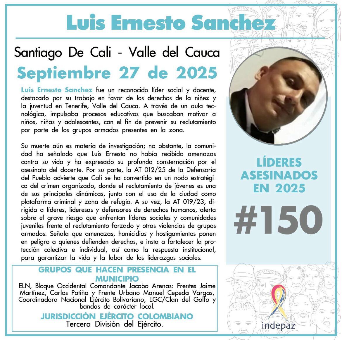 La más reciente víctima fue Luis Ernesto Sánchez, reconocido líder social y docente, destacado por su trabajo en defensa de los derechos de la niñez y la juventud en Tenerife, Valle del Cauca. A través de un aula tecnológica, impulsaba procesos educativos para motivar a niños, niñas y adolescentes, con el fin de prevenir su reclutamiento por parte de grupos armados presentes en la zona.