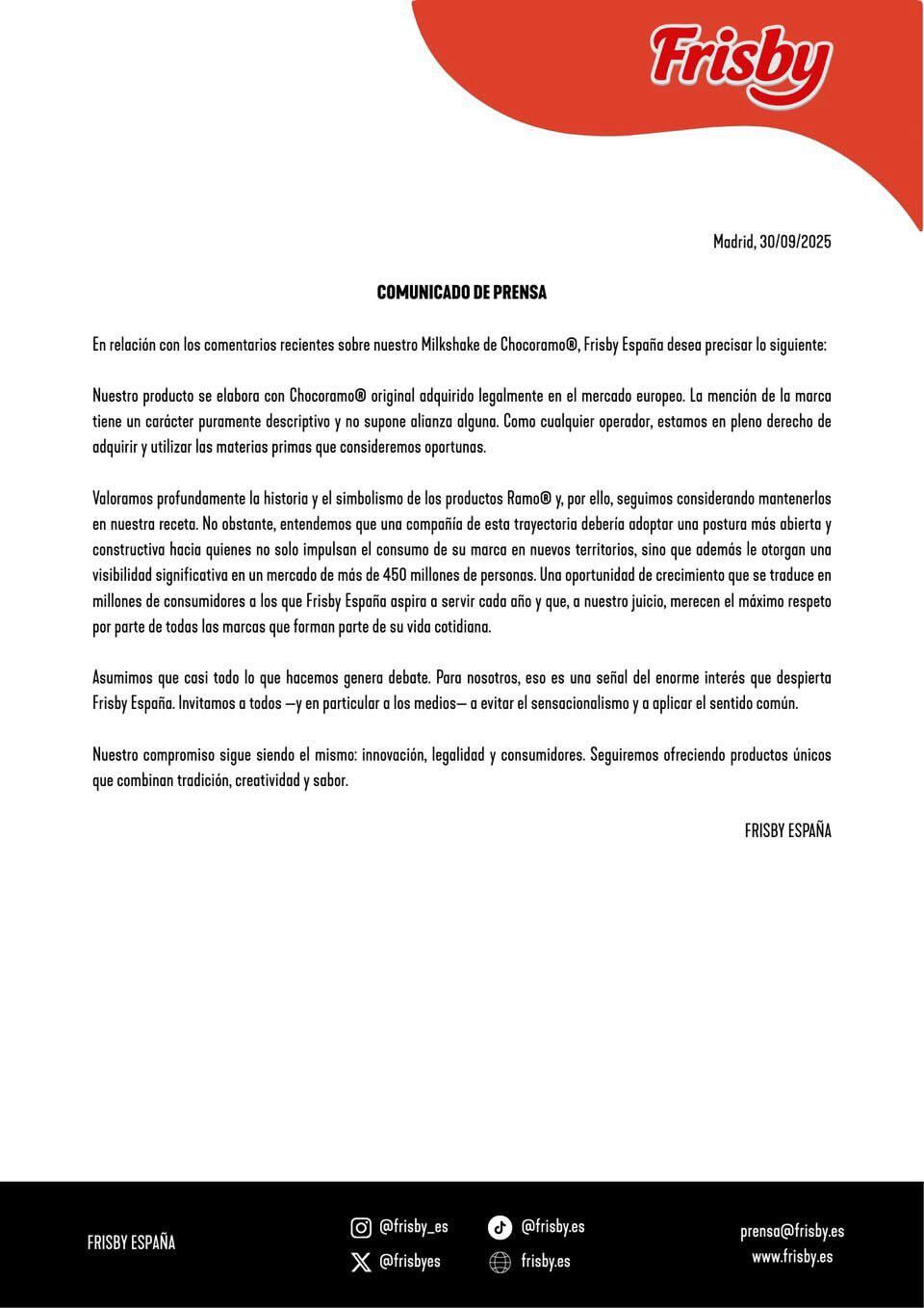 En un comunicado de prensa al que ha tenido acceso la redacción de W Radio, la marca Frisby España aclara cuál es la relación comercial que tiene con la empresa colombiana de alimentos Ramo, tras haber incluido dentro del menú la ‘Chocoramo Shake’.