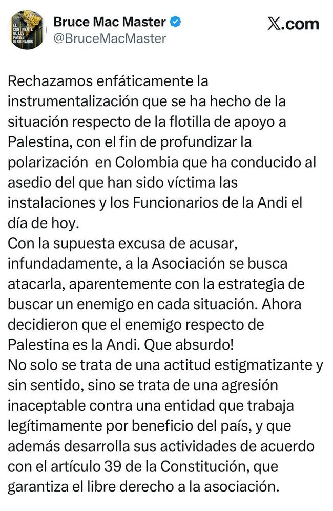 “Rechazamos las declaraciones donde se dice que la Asociación normaliza el comercio con el sionismo. Son afirmaciones que estigmatizan un sector como el productivo que aporta a la generación de empleo en el país. Como tampoco, es responsable poner en riesgo la estructura de relaciones comerciales, donde es el Gobierno Nacional quien las debe liderar con una visión de largo plazo y con la mayor estrategia posible”, aseguró el presidente de la Andi, Bruce Mac Master.