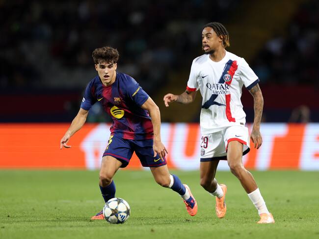 Pau Cubarsí y Bradley Barcola durante el Barcelona vs. PSG de Champions League. FOTO: Judit Cartiel/Getty Images / Judit Cartiel