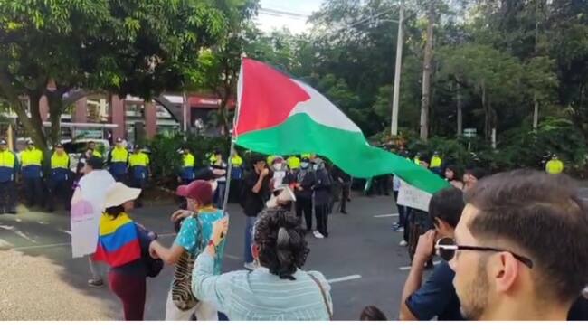 Con banderas de Palestina y diferentes consignas, varios activistas mostraron su apoyo al Global Movement To Gaza Colombia, que señala a la asociación gremial de tener “vínculos directos con la misión económica de Israel en Colombia”.