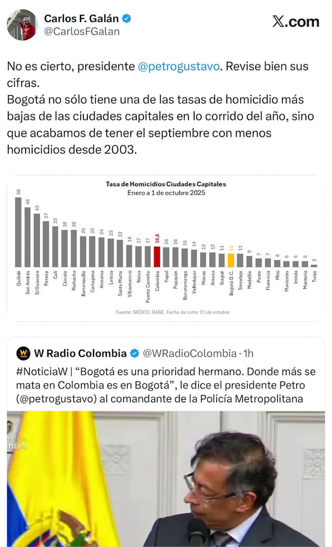 “No es cierto, presidente Petro. Revise bien sus cifras. Bogotá no solo tiene una de las tasas de homicidio más bajas de las ciudades capitales en lo corrido del año, sino que acabamos de tener el septiembre con menos homicidios desde 2003.