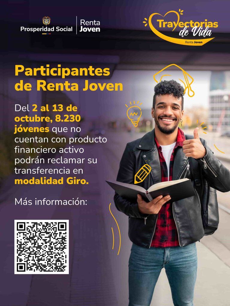 El Departamento Administrativo de Prosperidad Social anunció que del 2 al 13 de octubre se entregarán las transferencias de modalidad giro del programa Renta Joven.