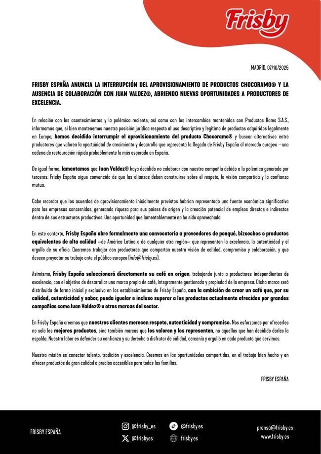 La noticia sobre la salida de la malteada Chocoramo del menú se dio a conocer a través de un comunicado publicado por Frisby España donde de forma textual la marca "anuncia la interrupción del aprovisionamiento de productos Chocoramo y la ausencia de colaboración con Juan Valdez, abriendo oportunidades a productores de excelencia".
