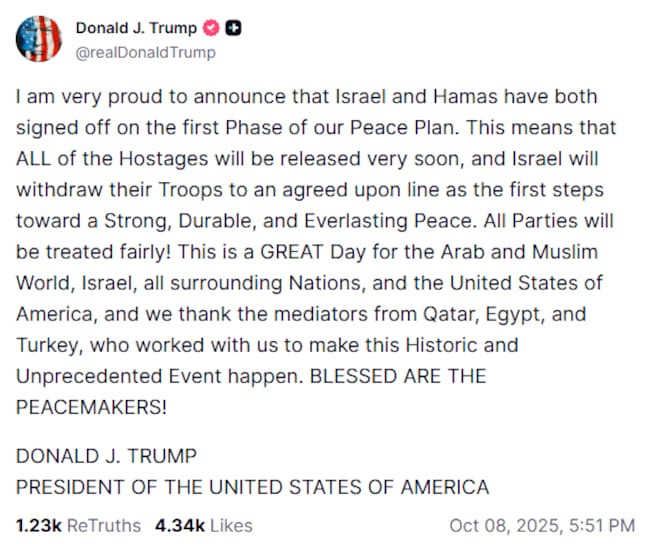 En su mensaje, Donald Trump menciona dos de los principales temas en los que los negociadores han estado trabajando esta semana en Egipto: la liberación de rehenes y la retirada israelí de ciertas partes de Gaza.