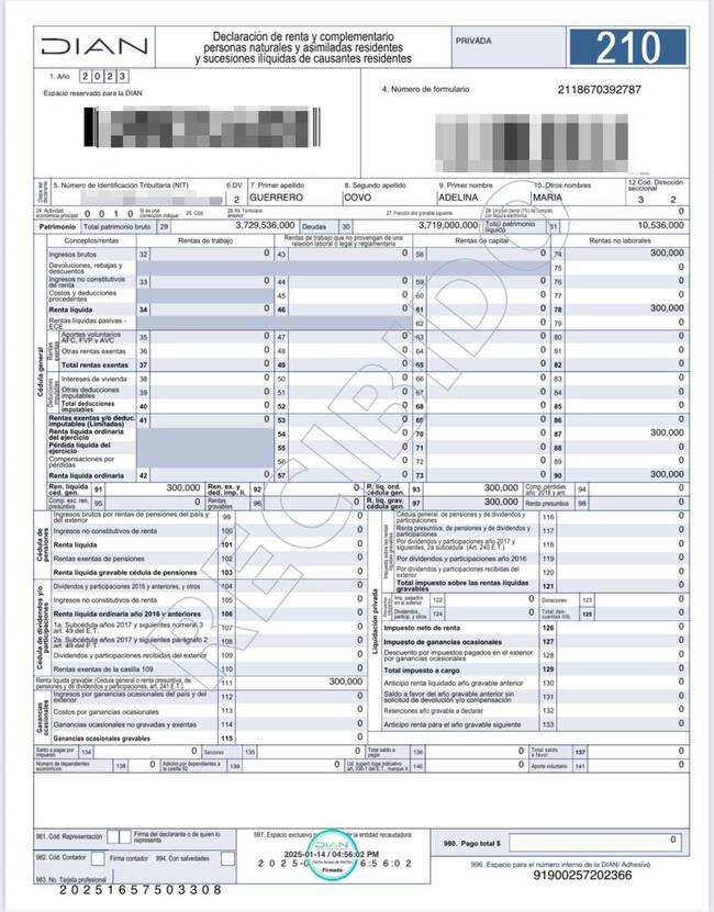 Me dijo que el préstamo fue hecho no a él, sino a su esposa Adelina Guerrero, quien lo declaró. Cuando le pedí copia de la declaración de ella. Me mandó la declaración del año 2023 que realmente fue radicada en enero de este año, 2025.