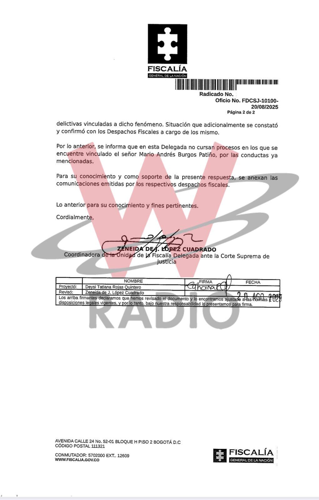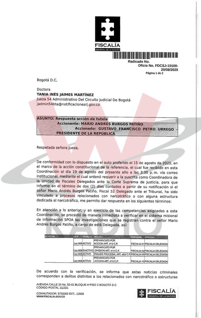 La W conoció en primicia un documento que la Fiscalía General de la Nación envió al Juzgado 54 Administrativo del Circuito de Bogotá, el cual recientemente le ordenó al presidente Gustavo Petro rectificarse de los señalamientos en contra del fiscal Mario Burgos.