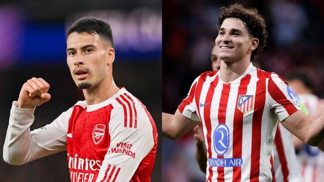Gabriel Martinelli del Arsenal y Julián Álvarez del Atlético de Madrid. FOTOS: Vince Mignott y Guillermo Martínez/Getty Images