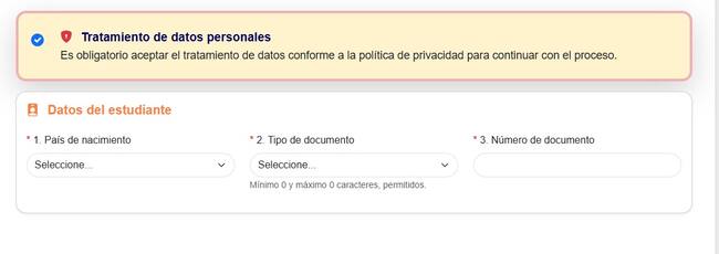 - Deberá llenar la primera parte del formulario, en ella le solicitarán la información del ESTUDIANTE: 1) País de nacimiento 3) tipo de documento 3) Número de documento