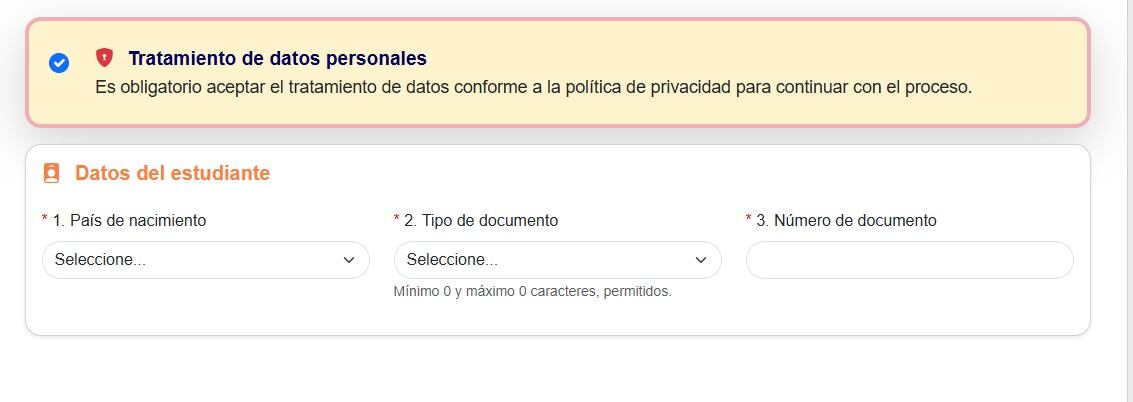 - Deberá llenar la primera parte del formulario, en ella le solicitarán la información del ESTUDIANTE: 1) País de nacimiento 3) tipo de documento 3) Número de documento