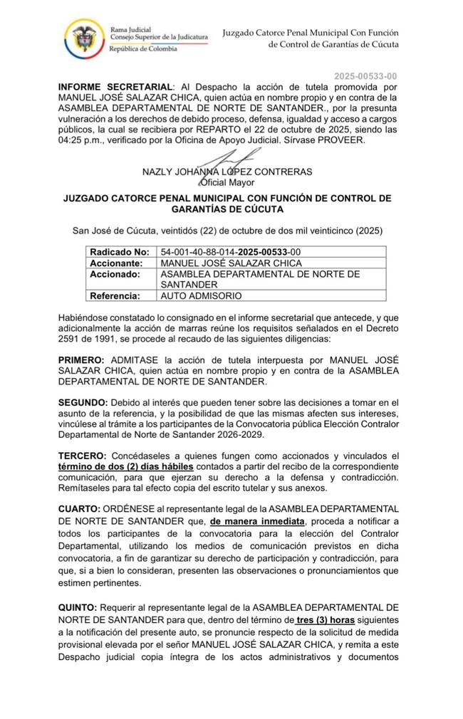 El Juzgado Catorce Penal Municipal con Función de Control de Garantías de Cúcuta admitió una acción de tutela presentada por Manuel José Salazar Chica en contra de la Asamblea Departamental de Norte de Santander, por la presunta vulneración de sus derechos fundamentales al debido proceso, defensa, igualdad y acceso a cargos públicos, dentro del proceso de convocatoria para la elección del Contralor Departamental correspondiente al período 2026–2029.