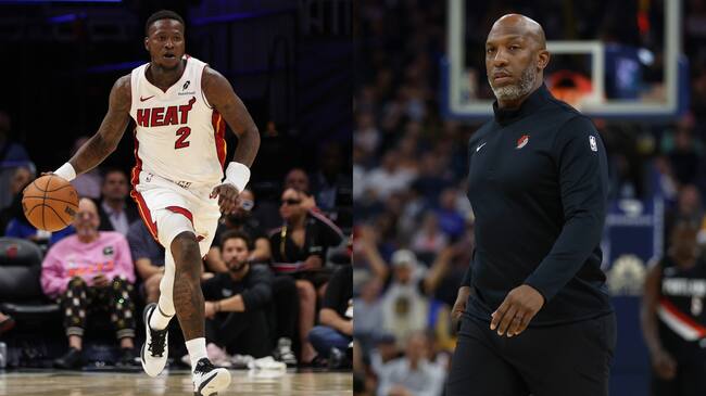 El jugador de los Miami Heat Terry Rozier y el entrenador de los Portland Trail Blazers, Chauncey Billups. Foto: Tomas Diniz Santos/Getty Images/Lachlan Cunningham/Getty Images