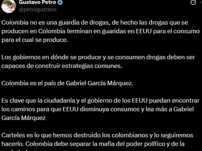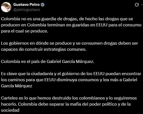 Sin embargo, en un mensaje publicado en su cuenta de X, Petro se defendió y rechazó los señalamientos de Trump, afirmando que las drogas que se producen en Colombia “terminan en guaridas en Estados Unidos para el consumo para el cual se produce”.
