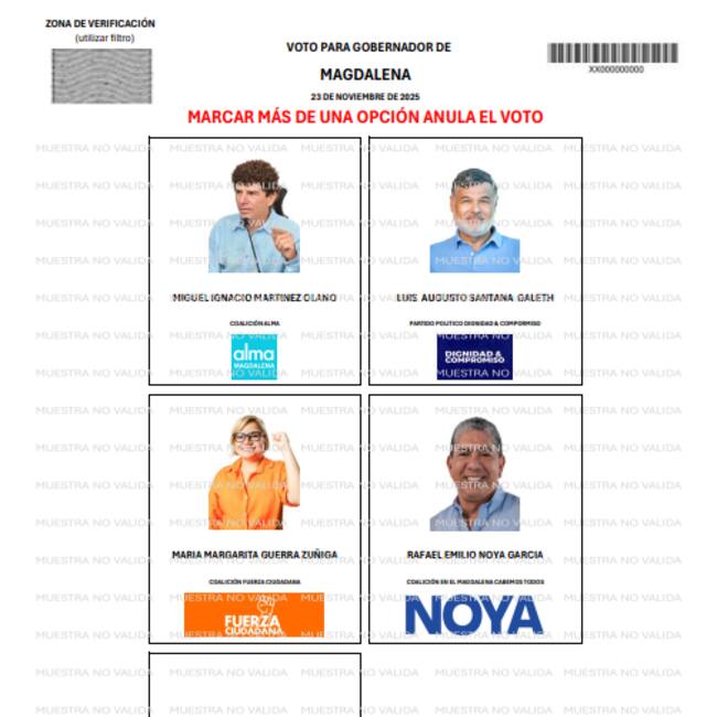 La Registraduría Nacional del Estado Civil dio a conocer el tarjetón para las elecciones atípicas a la Gobernación del Magdalena que se realizará el domingo 23 de noviembre de 2025, luego de que el Consejo de Estado confirmara el fallo de nulidad electoral del entonces gobernador del Magdalena, Rafael Martínez.