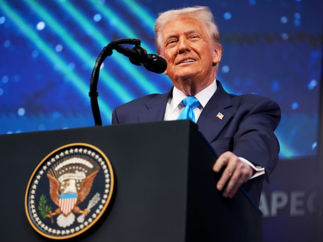 El presidente de Estados Unidos, Donald Trump, pronuncia un discurso durante la Cumbre de CEO de APEC en Gyeongju, Corea del Sur. FOTO: Andrew Harnik/Getty Images / Andrew Harnik