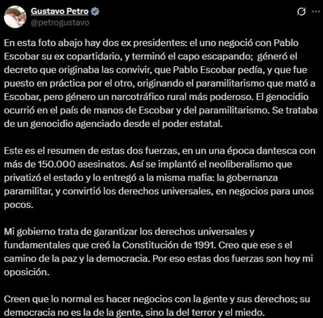 “En esta foto hay dos expresidentes: el uno negoció con Pablo Escobar, su ex copartidario, y terminó el capo escapando; generó el decreto que originaba las convivir, que Pablo Escobar pedía, y que fue puesto en práctica por el otro, originando el paramilitarismo que mató a Escobar, pero generó un narcotráfico rural más poderoso”, escribió Petro en su cuenta de X.