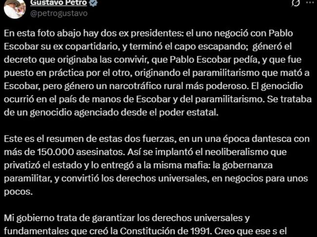 “En esta foto hay dos expresidentes: el uno negoció con Pablo Escobar, su ex copartidario, y terminó el capo escapando; generó el decreto que originaba las convivir, que Pablo Escobar pedía, y que fue puesto en práctica por el otro, originando el paramilitarismo que mató a Escobar, pero generó un narcotráfico rural más poderoso”, escribió Petro en su cuenta de X.