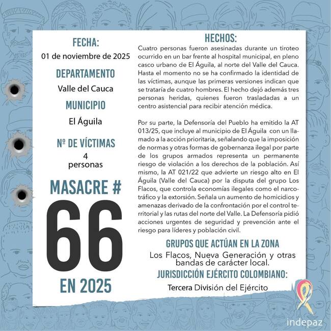 Una alerta temprana de la Defensoría del Pueblo advierte sobre la presencia de los grupos delincuenciales Los Flacos, Nueva Generación y otras bandas de carácter local que se disputan el control del narcotráfico y la extorsión en el municipio. Según Indepaz, esta sería la masacre número 66 en lo corrido del año 2025 en Colombia.
