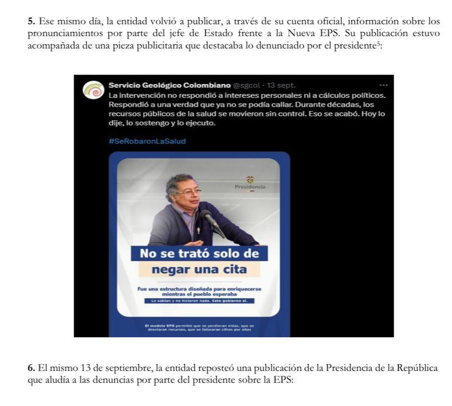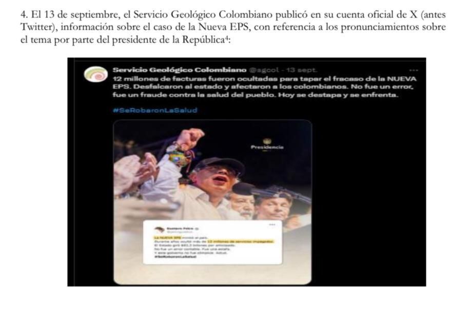 “El SGC, una entidad científica cuya misión es el monitoreo sísmico y geológico, difundió mensajes asociados a campañas políticas y proselitistas del Gobierno, con el uso de los hashtags #SeRobaronLaSalud, #TrumpSeEquivocóDePaís y #El24ALaPlaza, este último para llamar a la movilización convocada por el presidente”, se indicó en el documento.