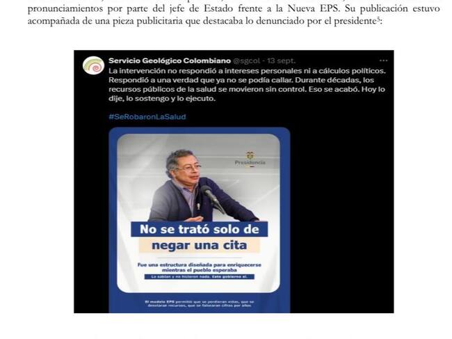 Según la demanda, en las cuentas de redes sociales del SGC, destinadas a informar a los colombianos sobre temas de interés público, se realizaron publicaciones con contenido político y proselitista.