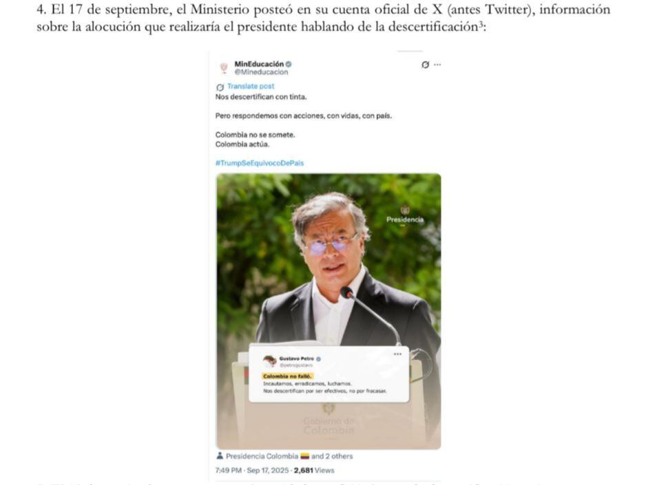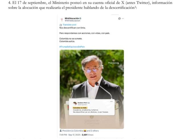 Desde la cuenta oficial de la cartera de Educación también se habrían compartido piezas y mensajes de tinte político que no hacen parte de su trabajo institucional.