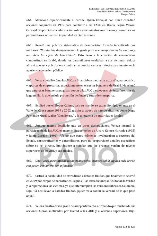 Según la sentencia, Veloza “participó en 52 versiones libres, 120 indagatorias y entre 25 y 30 diligencias ante la Corte Suprema de Justicia, lo que lo convirtió en uno de los exparamilitares más colaborativos del proceso”. En esos espacios abordó temas sobre la expansión del paramilitarismo, los vínculos con narcotraficantes, políticos y miembros de la Fuerza Pública.