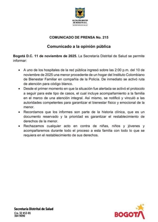 “A uno de los hospitales de la red pública ingresó sobre las 2:00 de la tarde del 10 de noviembre de 2025 una menor procedente de un hogar del Icbf en compañía de la Policía. De inmediato, se activó ruta de atención para código blanco”, aseguraron desde la entidad de salud.