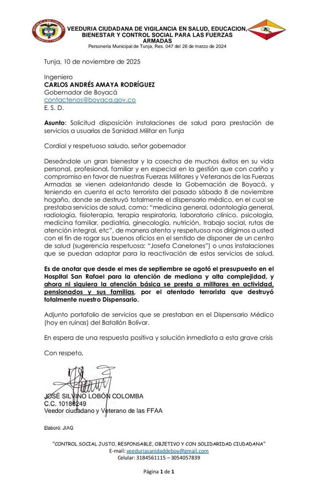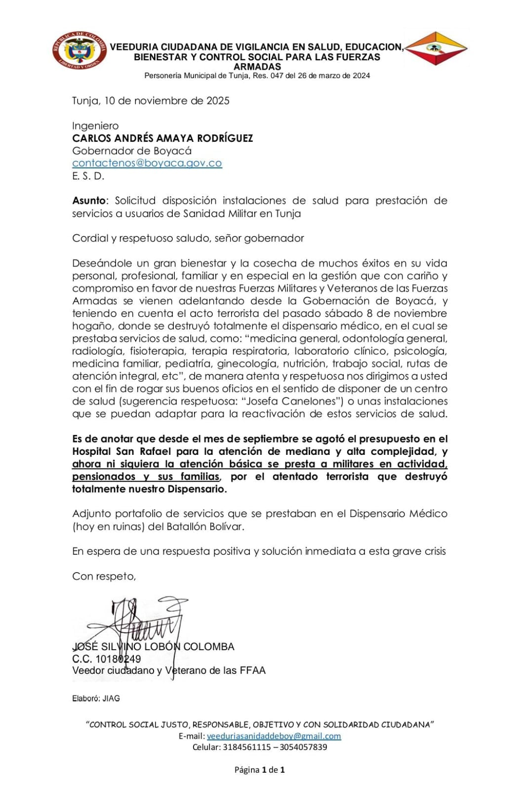 “Con este atentado terrorista se destruyó el dispensario médico donde prestaban servicios de salud del nivel básico a todos los usuarios del subsistema de salud de las Fuerzas Militares, a todo el personal en actividad, sus familias, el personal que se encuentra con asignaciones de retiro, pensionados, a la familia de este personal, a todos los usuarios que son residentes aquí en Tunja, en estos municipios aledaños. Allí en el Batallón, en el dispensario médico, se prestaban algunos servicios como medicina general, odontología, radiología, fisioterapia, terapia respiratoria, laboratorio clínico, psicología, medicina familiar, pediatría, ginecología, nutrición, trabajo social, rutas de atención integral”, aseguró Iván Amarillo, veedor de saludo de las Fuerzas Militares de Boyacá.
