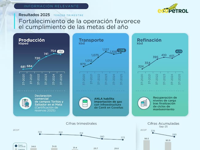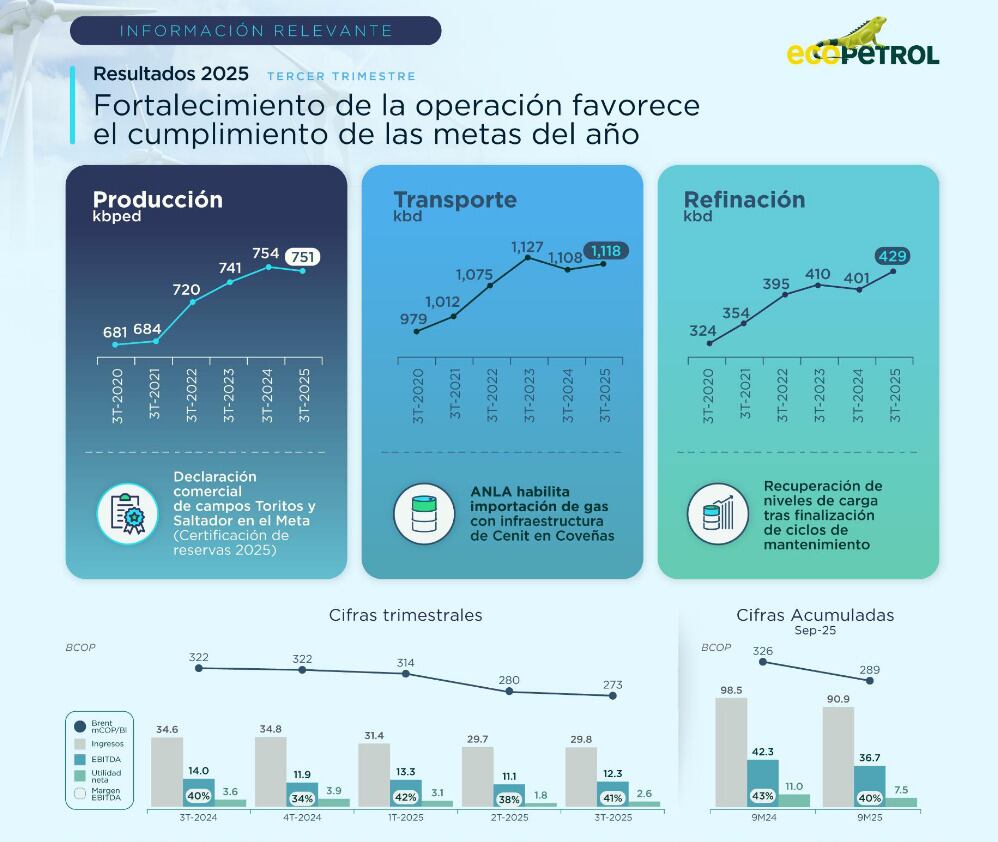 En cuanto al acumulado del año, es decir, enero – septiembre, el informe expuso que la petrolera tuvo ingresos por 90.9 billones, cifra inferior a los 98.5 billones de pesos que se habían alcanzado durante el mismo periodo del año anterior. Por el lado de la utilidad neta acumulada para lo que va corrido del 2025, la estatal alcanzó los 7,5 billones, cifra inferior en 31,8% a la registrada durante el mismo periodo de 2024, cuando las utilidades acumuladas enero – septiembre se ubicaron en 11 billones de pesos.